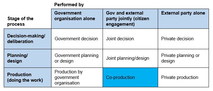 Moving to the second part of the term, ‘production’ means that the activity involves some kind of transformation of tangible or intangible inputs into more valuable outputs. Citizen engagement in government is a very broad field, and includes ways to involve citizens in policy-making, planning and service design to delivery and evaluation. Some definitions of co-production (for example that of Nabatchi and colleagues in this recent article) are broad enough to encompass all of the things in the middle column of Table 1. However, such a broad definition conceals the crucial feature that originally attracted so much attention in the 1980s: it is about who does the work, not who decides whether or how it is to be done.