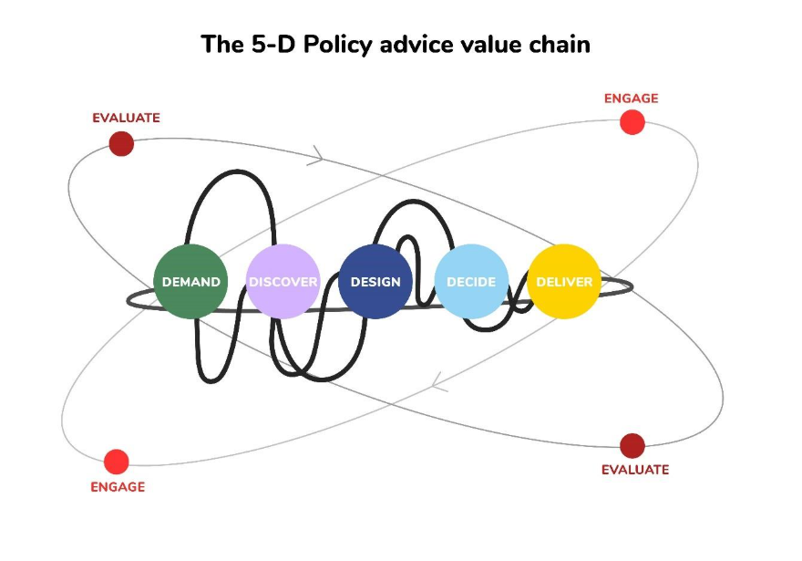 - A key ingredient in the policy infrastructure is a repeatable, scalable policy process model, like her ‘5D policy advice model’ which features in ANZSOG programs and has been adapted by the Irish government. A process model can act as “handrails, not handcuffs”, to guide public servants through the policy process, whether small tweaks to the status quo or large transformations. In contrast the traditional ‘policy cycle’ is “useful for teaching but not for doing”.