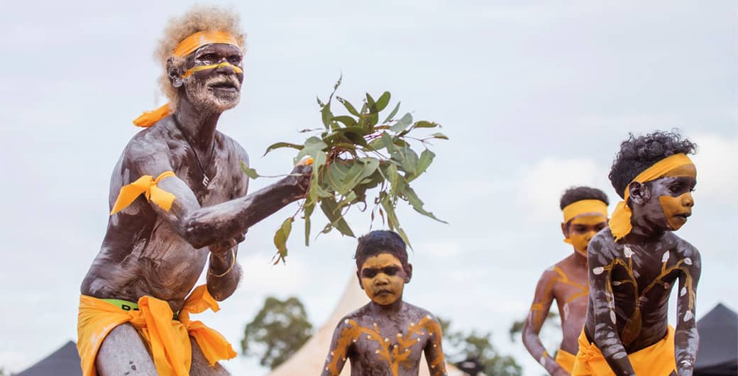 Image credit: Melanie Faith Dove, Yothu Yindi Foundation (yyf.com.au). Senior Yolngu man Eddie Gumbula and Gumatj clan boys performing bunggul (ceremonial dance) at the 2019 Garma Festival.