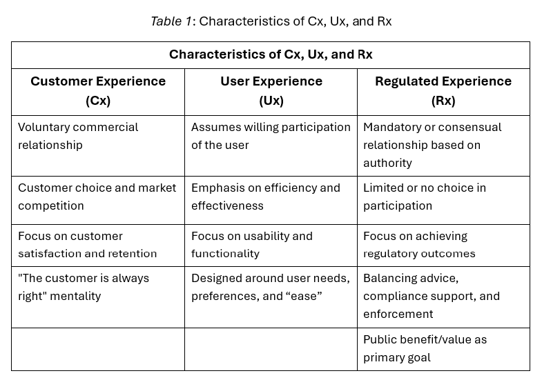 The authors believe that the unique nature of regulatory relationships requires a distinct framework, and one that the authors believe should be called or referred to as Regulated Experience (Rx).