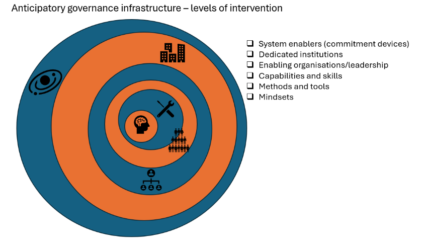 System change requires a range of mutually reinforcing initiatives, at various levels of intervention, from system enablers to individual mindsets. It requires a deliberate infrastructure for anticipatory governance (Figure 1.) and ongoing effort.