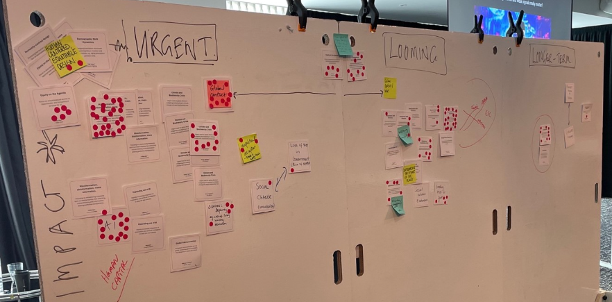 We then used a mega-trend card-sorting exercise to help identify what participants saw as the most important trends deserving collective attention over time. We asked them to call out cross-cutting policy issues that tend to fall through the administrative cracks (departmental or portfolio) because they are everyone’s and no-one’s. We also asked them to identify weak signals stemming from seemingly disconnected pieces of information that may point to a significant emergent policy issue.