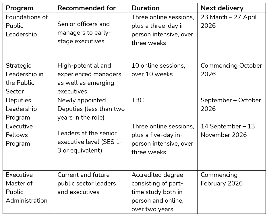 | Foundations of Public Leadership | Senior officers and managers to early-stage executives | Three online sessions, plus a three-day in person intensive, over three weeks | 23 March – 27 April 2026 |