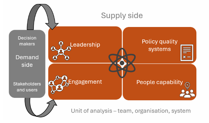 - Organisational capability: Many organisations have engagement specialists on staff, but they are often only involved at the end of the policy process when their job is limited to communicating or ‘selling’ a policy. How might they be more effectively involved in the policy process upfront and how might they be enlisted to help build the engagement skills of policy staff?
